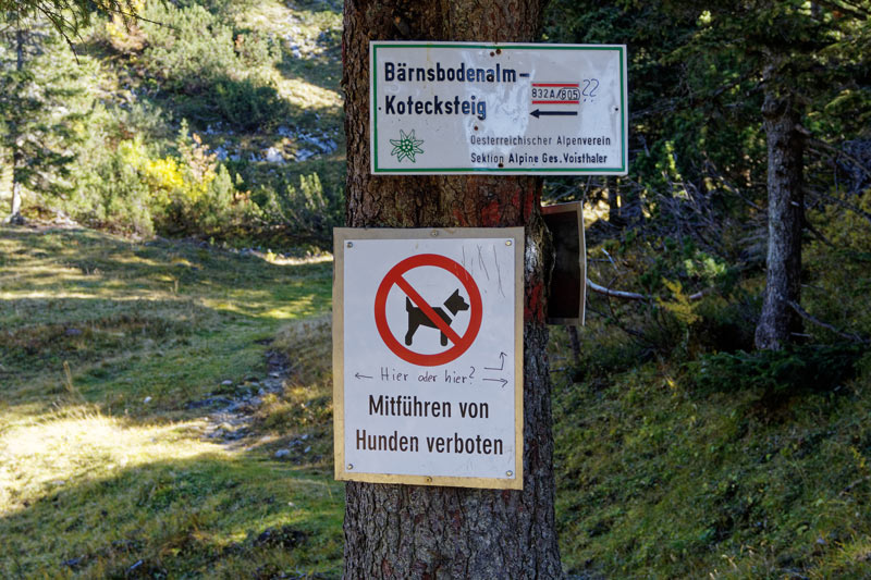 Update 2019-10-17: Heute habe ich die Pächterin der Sonnschienalm erreicht, lt. Aussage der Pächterin haben sie die Tafeln auch erst nach der Jagdsperre gesehen, aber sich nicht darum gekümmert, denn es gehen immer wieder Leute mit Hund zur Sonnschienalm.